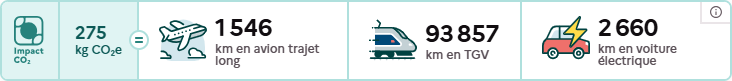 La suppression des données présentes sur notre site permet de supprimer l’équivalent de 275 Kg CO² équivalent. Vous trouverez ci-dessous une image indicative de ce que cela représente en émission de différents transports